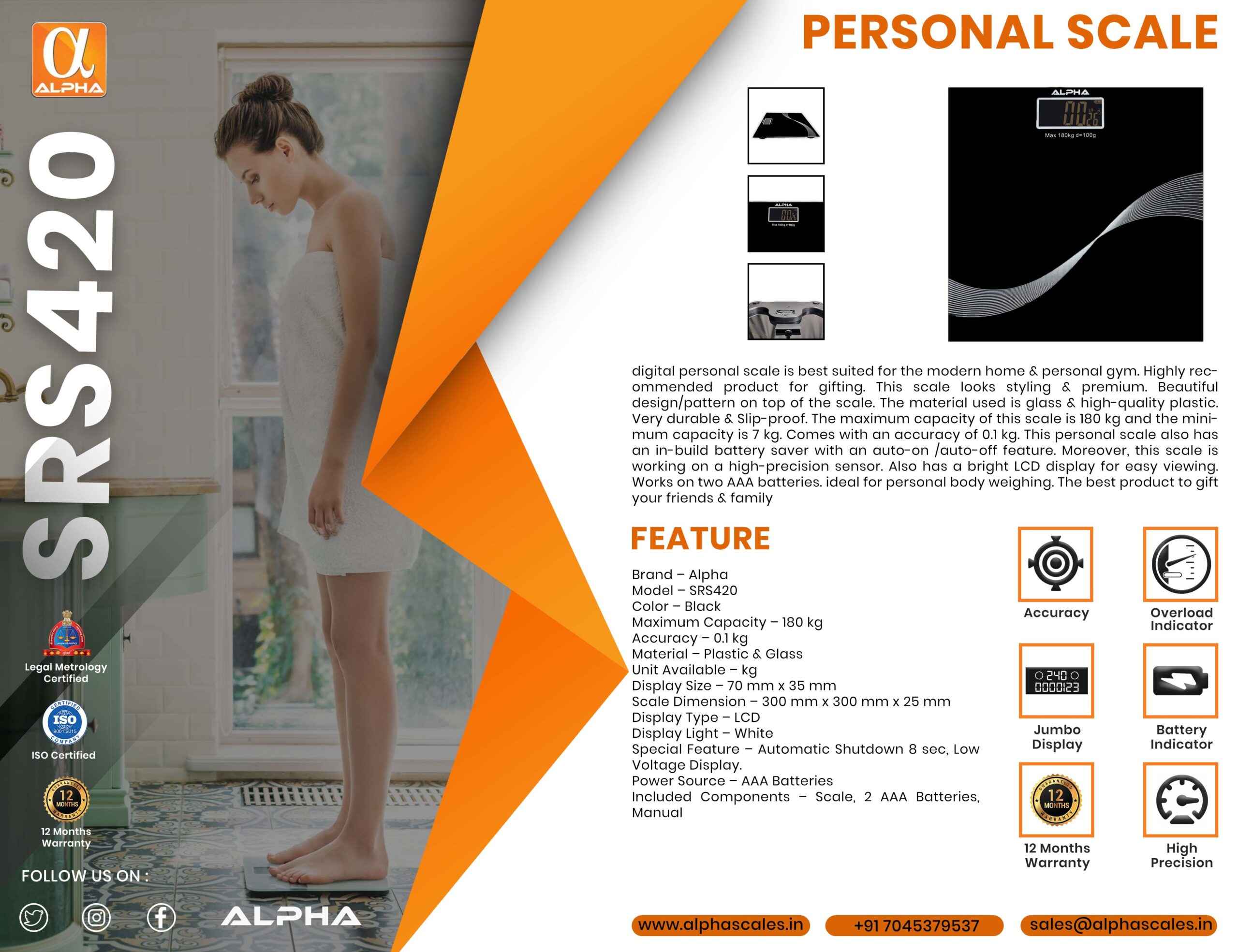 SRS 420 digital body scale is best suited for the modern home & personal gym. Highly recommended product for gifting. This scale looks styling & premium. Beautiful design/pattern on top of the scale. The material used is glass & high-quality plastic. Very durable & Slip-proof. The maximum capacity of this scale is 180 kg and the minimum capacity is 7 kg. Comes with an accuracy of 0.1 kg. This body scale also has an in-build battery saver with an auto-on /auto-off feature. Moreover, this scale is working on a high-precision sensor. Also has bright LCD display for easy viewing. Works on two AAA batteries. ideal for personal body weighing. The best product to gift your friends & family. This body scale 6 months warranty for manufacturing defect