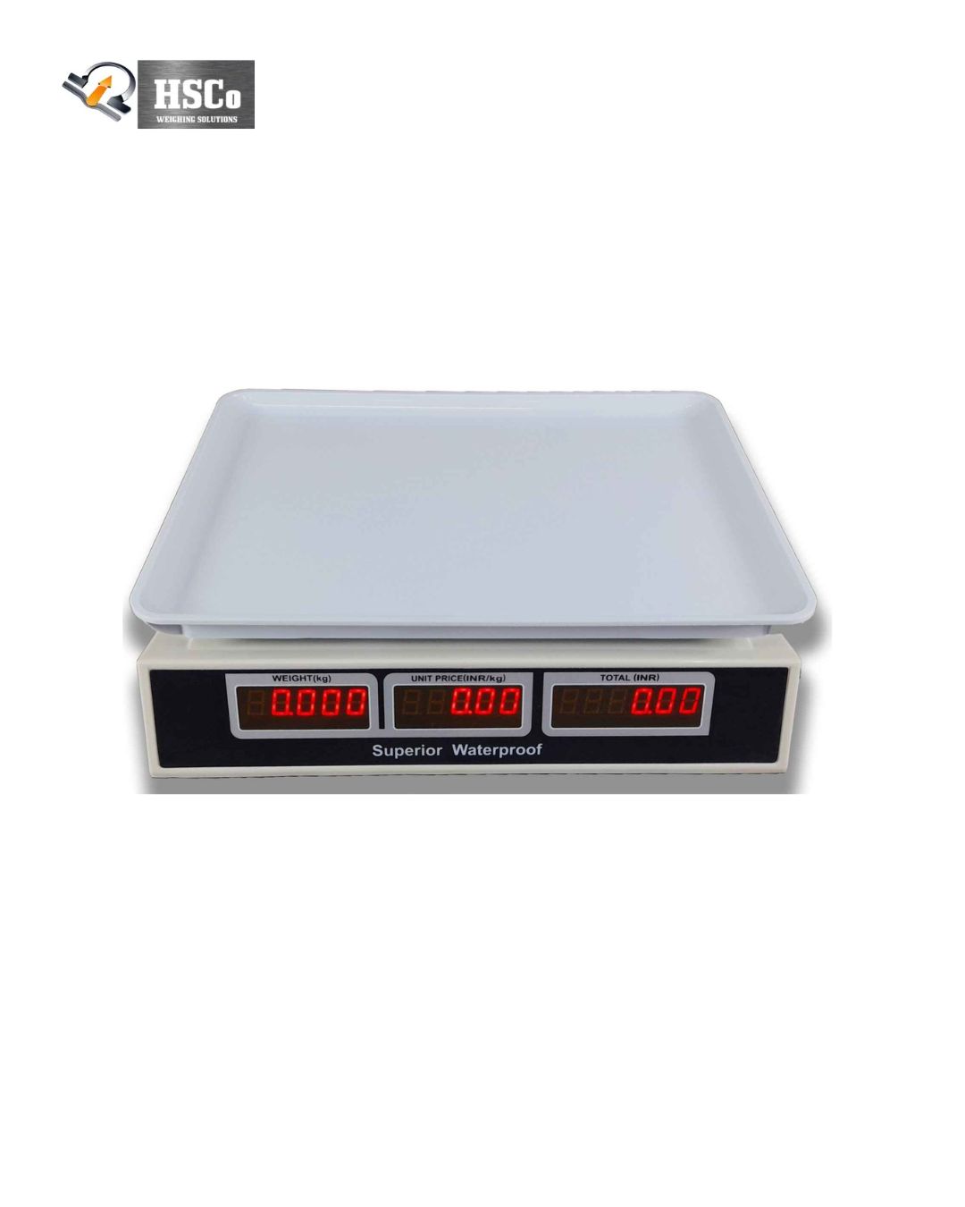 ABSWR Waterproof Price Computing Scale has an ABS body. Water Proof Construction – IP68 can be fully immersed in water and still no problem with Weighing. Moreover, it has Anti-Drifting Feature along with TARE / ZERO Button. Also, it has 100% overload capacity. This Scale also has Water Proof Motherboard. It has Front and Back Displays for convenience for customers. In addition, this Scale has Sturdy Construction. Waterproof Price Computing Scale also has an Exclusive Year Warranty against Manufacturing Defects. Along with a Huge Capacity of 30 kg with an accuracy of 5 gm. Most Importantly is Stamped by the Legal Metrology Department. Secondly, Battery Backup of At least 25 hours. Thirdly. Waterproof Price Computing Scale Scale is Made in India. This Scale is the most Affordable Weighing Scale. Ideal for Retail/Fishing and Poultry. FEATURES- Precision Load Cells